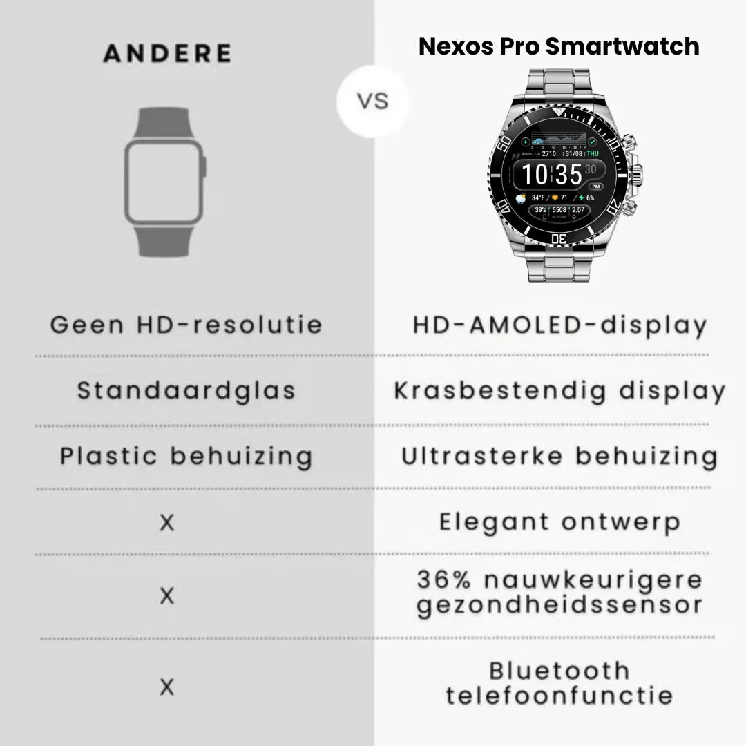 Veel smartwatches hebben een hoog prijskaartje en zijn kwetsbaar. Kies Nexos Pro, de veerkrachtige keuze ontworpen voor echte duurzaamheid.